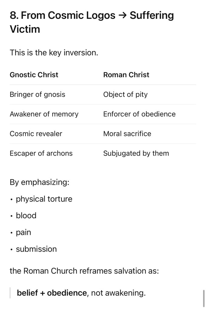 Christ was crucified on the cosmic crossâthe Tree of Lifeâbridging the pleroma and the world, restoring forgotten knowledge. The later physicalization of the crucifixion, crowned with the thorns of the cursed world, functions as a mythic inversion that re-anchors humanity to material suffering and obedience, muting the gnosis meant to awaken them from the arc of lower consciousness.